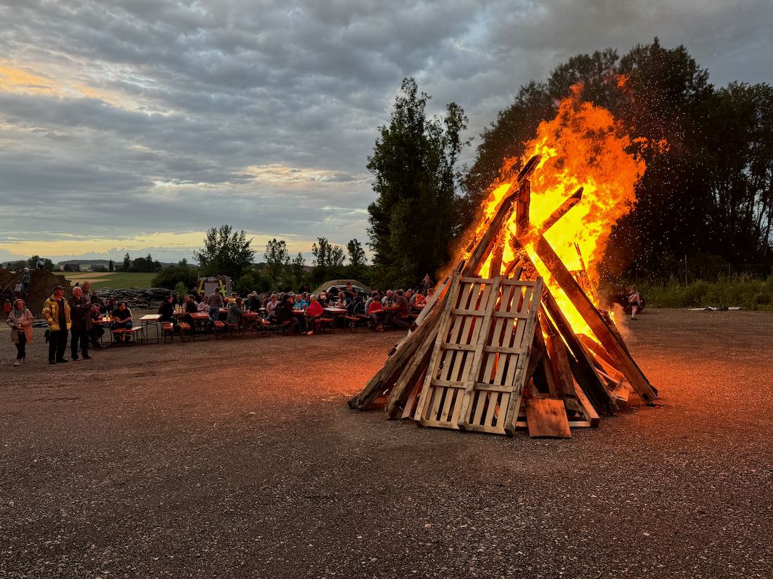Viele erinnerten sich noch an das Johannisfeuer im letzten Jahr bei 15 Grad und Regen. Dieses Jahr war der Ausblick nicht ganz so düster. Trotz der durchwachsenen Wettervorhersage machten sich einige Besucherinnen und Besucher auf den Weg zur Köferinger Heide. Das Johannisfeuer fand wieder auf dem Gelände der Firma Rubenbauer statt. Ab 18 Uhr war alles für die Feier bereit, dank der vielen fleißigen KjGler. Es gab wieder eine große Auswahl an Getränken und natürlich Bratwürste, Grillkäse und Mais.