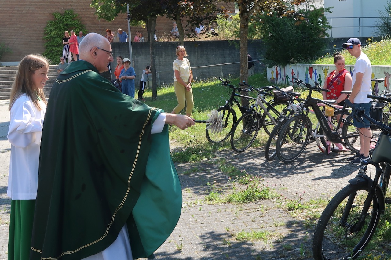 In der Pfarrei St. Michael gehört es zur guten Tradition, am vorletzten Julisonntag Fahrzeuge zu segnen, pünktlich bevor viele in den Urlaub fahren und dabei weite Strecken zurücklegen. Die Pfarrmitglieder sind mit Autos, aber auch mit Rädern, zum Rot-Kreuz-Platz gekommen, um dem fahrbaren Untersatz den kirchlichen Segen erteilen zu lassen.