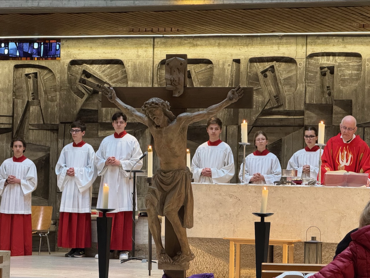 Der Karfreitag begann in der Pfarrei St. Michael um 10.00 Uhr mit dem Heilsweg in der Pfarrkirche. Der Heilsweg mit seinen 12 Bildern ist in der Pfarrkirche St. Michael an die Stelle eines klassischen Kreuzwegs getreten und wird in der Regel nur am Karfreitag gebetet. Er beinhaltet auf vier Bildern die Kreuzwegstationen, stellt diese aber ein einen größeren Zusammenhang. Er beginnt dort, wo die Welt ihren Ursprung hat und endet mit einem Bild des wiederkommenden Christus.