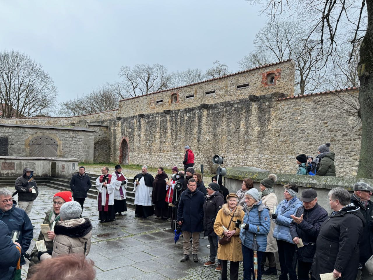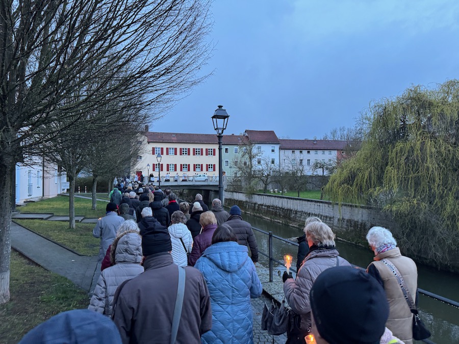 Nachdem im letzten Jahr viele Gläubige der Amberger Pfarreien den Kreuzweg gegangen waren, beschloss man, ihn erneut zu veranstalten. Dieses Jahr startete der Kreuzweg von St. Georg aus. Trotz der Kälte und des strömenden Regens versammelte sich eine beachtliche Anzahl von Gläubigen. Pfarrer Brunner begrüßte seine Priesterkollegen, die Franziskaner vom Maria-Hilf-Berg, sowie alle Mitarbeiter und Mitarbeiterinnen der Pfarreien zum zweiten Kreuzweg durch die Stadt. Es war erfreulich zu sehen, dass trotz des widrigen Wetters viele Gläubige hierher gekommen waren.